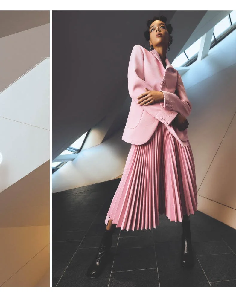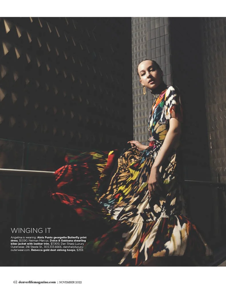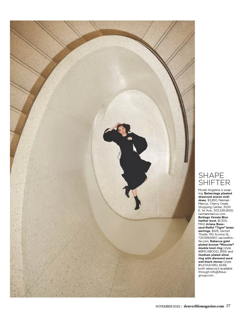 The magazine’s Creative Director chose the Denver Art Museum—a space defined by bold, sharp angles and massive scale—for a fall fashion feature. The challenge was to curate a selection of garments that could "hold their own" against the museum’s dominant architecture without the fashion becoming lost or the story feeling disjointed across vastly different galleries.